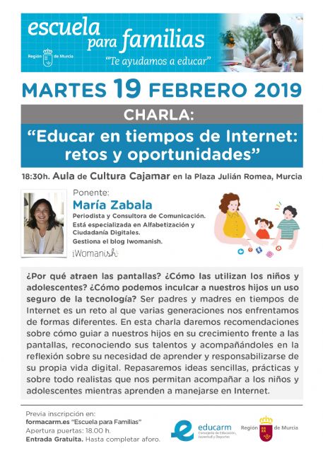 La charla 'Educar en tiempos de Internet: retos y oportunidades', que tendrá lugar a las 18:30 horas en el Aula de Cultura de Cajamar, en Murcia, está enmarcada en el programa 'Escuela de familias' puesto en marcha por la Consejería de Educación, Juventud y Deportes, y que oferta cursos y programas formativos destinados para mejorar el rendimiento académico del alumnado.