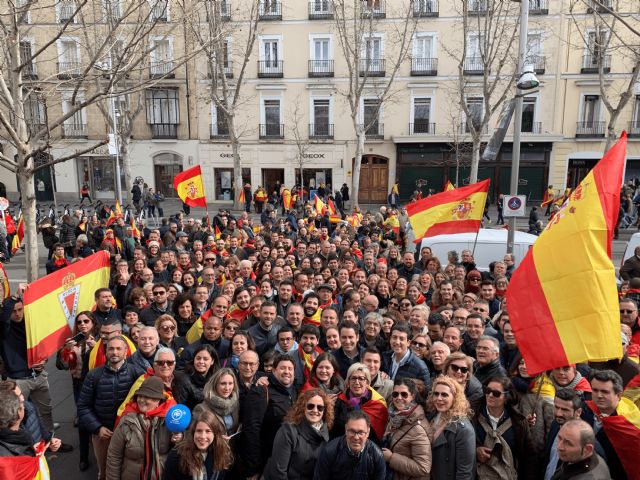 10 de febrero. El presidente del Partido Popular de la Región de Murcia, Fernando López Miras, ha afirmado tras la concentración celebrada esta mañana en Madrid que "a Pedro Sánchez solo le queda convocar elecciones tras el clamor de miles de españoles defendiendo la unidad de nuestro país". "Hoy lo españoles le hemos dicho que basta ya de traiciones, basta ya de poner el Gobierno de España en manos de quie-nes quieren romper la unidad de nuestro país", ha añadido.