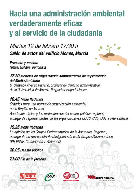 Intersindical Servicios Públicos y el resto de organizaciones sindicales de administración y servicios de la Comunidad Autónoma de la Región de Murcia, junto con los profesionales públicos de la gestión ambiental, organizan una jornada para el próximo 12 de febrero, con el título "Hacia una administración ambiental verdaderamente eficaz y al servicio de la ciudadanía", en la que van a debatir sobre los distintos modelos de gestión ambiental y dar voz a las demandas de estas empleadas y empleados de la Administración Regional.