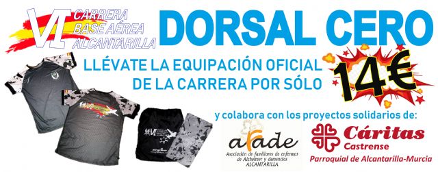 El Dorsal Cero lo podrán adquirir en el Stand que la Patrulla Acrobática de Paracaidismo del Ejercito del Aire (PAPEA) habilitará en la plaza de Adolfo Suárez el mismo día de la carrera por sólo 14€. A cambio, recibirá la camiseta oficial de la VI Carrera y una bufanda tubular a juego con la camiseta, al mismo tiempo que colabora para hacer más llevadera la vida diaria de muchas personas que lo necesitan, así como y mejorar la calidad de vida de sus familias.