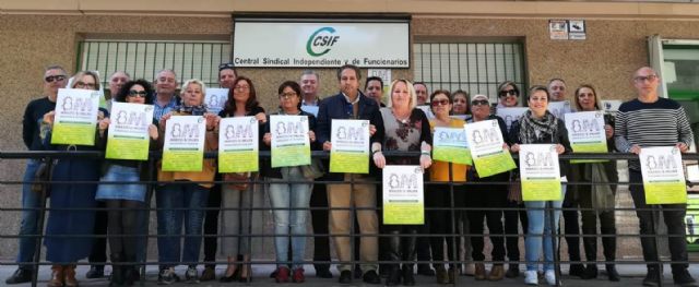 Afilados y simpatizantes de CSIF se han concentrado esta mañana a las puertas de la sede del sindicato en Murcia para denunciar las situaciones de discriminación, abuso y violencia que sufren las mujeres.