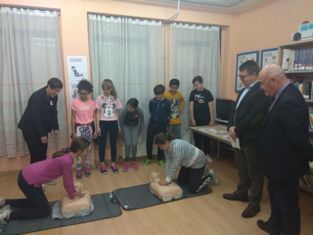 El director general de Atención a la Diversidad y Calidad Educativa, Francisco Martínez, junto al director general de Asistencia Sanitaria, Roque Martínez, asistieron a uno de los talleres de primeros auxilios y emergencias que se realizó en el CEIP Manuel Fernández Caballero de Murcia.