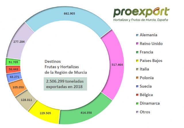 Por países, Alemania se mantiene como el principal destino de las exportaciones hortofrutícolas murcianas. Con 627 millones de euros y 662.905 toneladas, recibió el 25% del total exportado por la Región en 2018. Reino Unido es el segundo país de referencia para las frutas y hortalizas murcianas con 580 millones de euros y 517.464 tm. (23,2% del total) y Francia se sitúa en tercer lugar con 415 millones de euros y 414.358 tm., el 16,6% de las expediciones murcianas. Estos tres destinos representan el 64,8% de lo que la Región vendió e.