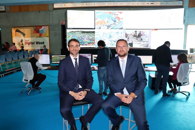 El director general de Informática, Patrimonio y Telecomunicaciones, Juan José Almela, acompañado del concejal de Modernización de la Administración y Desarrollo Urbano de Murcia, José Guillén, visitó hoy el foro y presidió ayer la entrega de los premios Digital Week, que recayeron en la Oficina de Transformación Digital de FREMM, en la empresa Syscomed, el Centro Criptológico Nacional, la Universidad de Murcia y el catedrático de economía aplicada Andrés Pedreño.