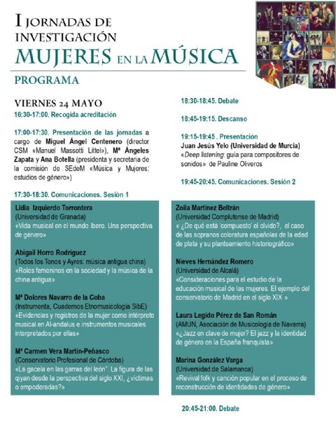 La conferencia inicial será pronunciada por Mª Ángeles Zapata, doctora en musicología, directora de las jornadas y presidenta de "Música y Mujeres: estudios de género", el viernes 24 a las 16.30h.