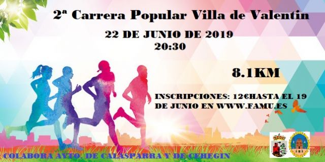El calendario popular nos llevará por segunda ocasión hasta Valentín, en cuestión de semanas. La pedanía de Cehegín y Calasparra acogerá el sábado 22 de junio, a partir de las 20:30h. la II Carrera Popular "Villa de Valentín", sobre un recorrido aproximado de 8,1km. con salida y meta en el Paseo de San Juan.