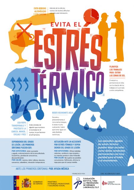 Por otra parte, la Fundación Laboral de la Construcción ha puesto a disposición de los trabajadores y empresarios del sector una serie de carteles informativos con consejos preventivos derivados de las condiciones climatológicas adversas, en concreto las que generan las altas temperaturas estivales. Entre los carteles, que pueden descargarse de manera gratuita a través de Línea Prevención, se ha creado uno dirigido a evitar el 'estrés térmico', en el que se hace hincapié en la importancia de planificar los trabajos para evitar las zonas de sol, beber abundante agua o usar ropa transpirable, entre otros asuntos. Para ampliar la información sobre el estrés térmico, sus síntomas y cómo actuar en caso de que ocurra, la Fundación también facilita a los trabajadores y empresas del sector un díptico informativo, disponible a través de la página web de Línea Prevención (www.lineaprevencion.com).