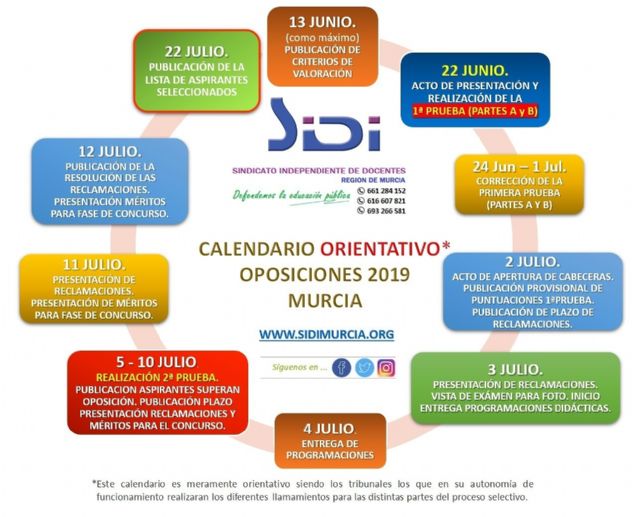Desde el pasado 22 de junio viene desarrollándose la oposición al cuerpo de Maestros. Esta oposición con más de 10.000 opositores debe desarrollarse hasta el 25 de julio como se establece en su orden de convocatoria, sin embargo, la Consejería de Educación comunica a los presidentes de tribunal un calendario que llama ORIENTATIVO, por motivos legales, pero que se obliga a su cumplimiento; y que desde el sindicato SIDI entendemos que puede influir directamente en el desarrollo del proceso de oposición.