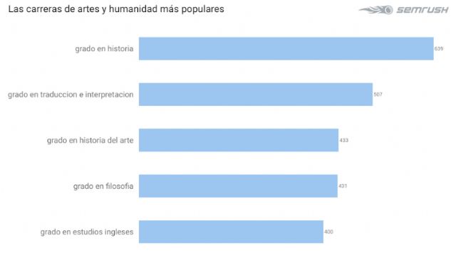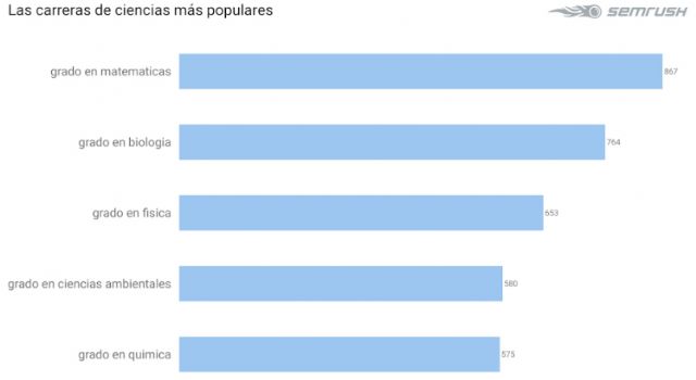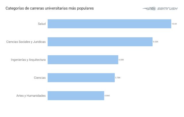 El tipo de carrera que más registros de búsquedas ha generado entre los estudiantes españoles ha sido el de Ciencias de la Salud y de entre todas las modalidades de estudios académicos es el que ocupa el primer puesto. De entre todos, es el Grado en Psicología el que más interés ha generado entre los internautas españoles llegando a alcanzar 1.500 registros de búsquedas en el último año, a gran distancia y en último lugar de la tabla, el grado en medicina, que solo consigue 830 búsquedas en Google en el mismo periodo de tiempo.