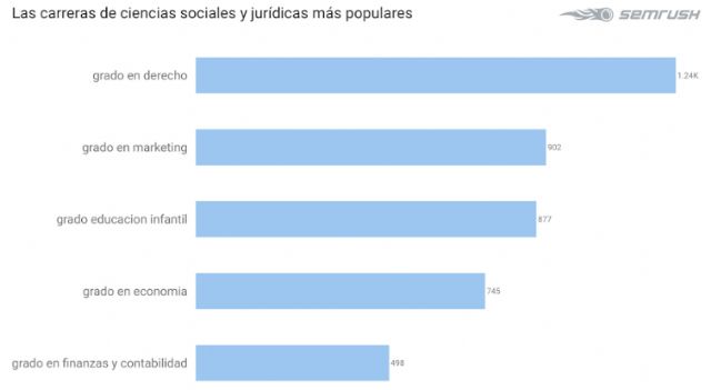 Las Ciencias Sociales y Jurídicas también están en el punto de mira de los alumnos. Es el Grado en Derecho el que acumula un mayor número de búsquedas en Google, seguido del Grado en Marketing y el de Educación Infantil siendo éstas tres profesiones las que encabezan el ranking de las carreras de Ciencias Sociales y Jurídicas.