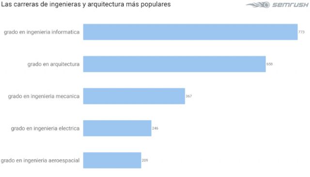 La Ingeniería Informática y la Arquitectura, junto a la Ingeniería Mecánica son las tres carreras que en esta área del saber acumulan un mayor número de búsquedas, siendo la Ingeniería Aeroespacial la que menos registros de búsqueda ha generado en el último año.