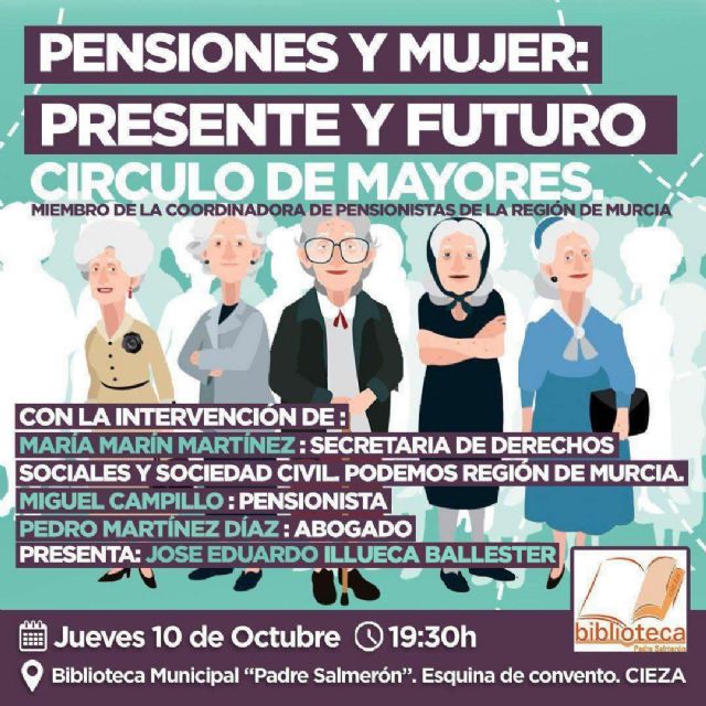 El círculo de mayores de Podemos Región de Murcia ha organizado para mañana, jueves 10 de octubre, una mesa redonda centrada que bajo el título "Pensiones y Mujer" analizará la problemática de las jubiladas, que son las que principalmente reciben las pensiones más bajas y se encuentran en un mayor riesgo de exclusión. El acto tendrá lugar en la Biblioteca Municipal "Padre Salmerón" de Cieza, a partir de las 19.30h.