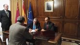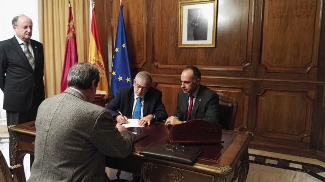 El presidente de la Asamblea Regional, Alberto Castillo, y el rector de la UPCT, Alejandro Díaz Morcillo, han firmado hoy ante notario el acuerdo para prorrogar la estancia de la Universidad en la residencia Alberto Colao hasta el 31 de diciembre de 2022.