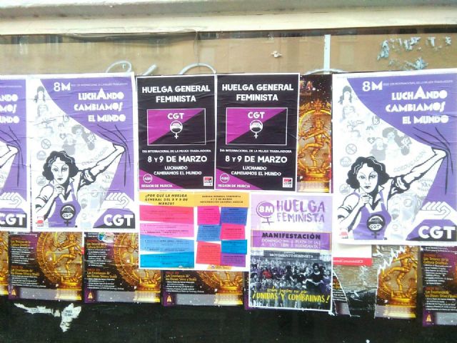 Anoche se realizó la primera pegada de carteles de la Huelga General Feminista convocada por la Confederación General del Trabajo (CGT) para los días 8 y 9 de marzo de 2020 en la Región de Murcia. Desde este sindicato, junto con la participación de otros colectivos feministas y de estudiantes, se está llevando a cabo la distribución de material para que la convocatoria llegue a todos los puntos de la región.