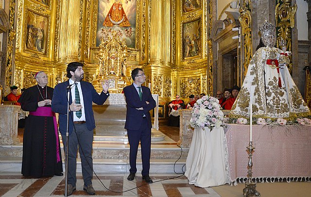 "Es todo un honor poder entregar a la Diócesis de Cartagena a la patrona de todos los murcianos", destacó el presidente, quien aseguró que la imagen "ha estado en las mejores manos y hoy podemos ver el resultado".