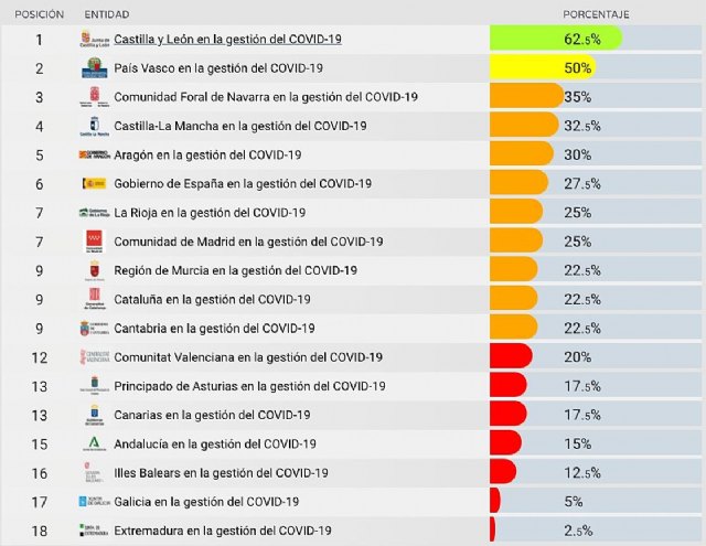 Tras un periodo de dos meses desde su lanzamiento, hoy se publica el Ranking que posiciona al Gobierno de España y los 17 gobiernos autonómicos. Entre los resultados destaca, que los evaluados, han cumplido de media sólo con el 25,88%, lo que se traduce en una nota aproximada de un 2,5 sobre 10. No obstante, es importante destacar que existen grandes diferencias entre las administraciones evaluadas. Hablamos de casi 60 puntos porcentuales, entre el líder del Ranking, el Gobiernocastellano y leonés con un cumplimiento del 62,5% de los indicadores, y el extremeño, en la cola, con un 2,5%. En segundo lugar, encontramos al Gobierno Vasco que, con su amplio recorrido en gobierno abierto, obtiene un 50%, seguido del Gobierno de la Comunidad Foral de Navarra, que ocupa el tercer lugar con un 35%, en cuarto y muy de cerca, el Gobierno castellanomanchego cumpliendo un 32,5% de los indicadores. En el medio del Ranking y en línea con la media, entre el 30% y el 20%, se encuentran el Gobierno de España, el de Aragón, La Rioja, la Comunidad de Madrid, la Región de Murcia, Cataluña y Cantabria. La cola del Ranking, por debajo del 20%, la ocupan los de la Comunitat Valenciana, el Principado de Asturias, Canarias, Andalucía, Islas Baleares, Galicia y Extremadura.