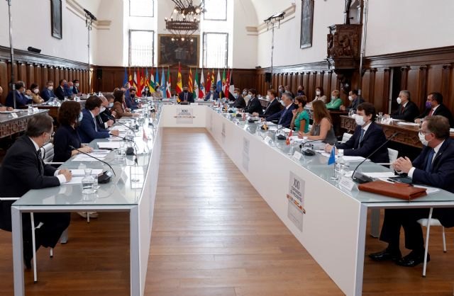 El jefe del Ejecutivo regional, Fernando López Miras, participó hoy en la XXI Conferencia de Presidentes, celebrada en La Rioja, donde reclamó que el criterio de reparto de los fondos europeos para hacer frente al covid-19 que llegarán a España "no sirvan para discriminar a unos territorios frente a otros o repartir de forma arbitraria ese fondo".