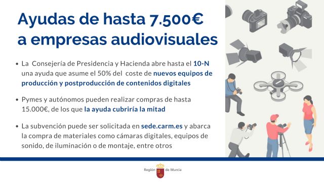 La Consejería de Presidencia y Hacienda ha lanzado una nueva ayuda al sector audiovisual de la Región de Murcia, para contribuir a su modernización y mejora de recursos técnicos. Concretamente, se trata de subvenciones de hasta 7.500 euros a pymes y autónomos de esta parcela económica, con las que cofinanciar los gastos para la adquisición de equipamiento de producción y postproducción de contenidos digitales tales como cámaras de vídeo digitales, equipos de sonido, de montaje o de iluminación, entre otros.