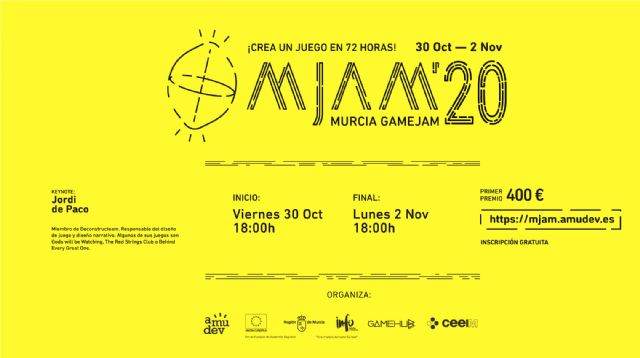 El mayor maratón regional de desarrollo de proyectos de videojuegos “Murcia Game Jam” (MJAM ) celebrará su cuarta edición del 30 de octubre al 2 de noviembre próximos con las novedades de ser online y durar tres días para disfrutar más aún creando juegos electrónicos. La participación es gratuita, previa inscripción en https://mjam.amudev.es