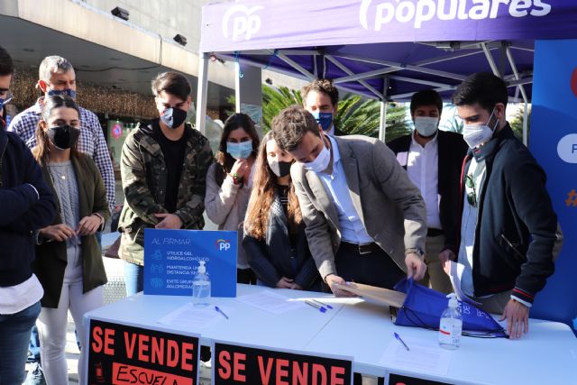 Además, tras acercarse al punto de recogida de firmas contra la Ley Celaá instalado por el PP en el centro de la ciudad de Murcia, Casado, López Miras y García Egea se han reunido con el presidente del Comité de Personas con Discapacidad y sus Familias de la Región de Murcia, (CERMI), Pedro Martínez, CERMI, el presidente de la Confederación Católica Nacional de Padres de Familia y Padres de Alumnos de la Región (CONCAPA), Alberto González, y el presidente de la Asociación de Centros de Enseñanza Privada de la Región de Murcia, José Francisco Parra, para trasladarles el posicionamiento del PP contra la Ley Celaá.