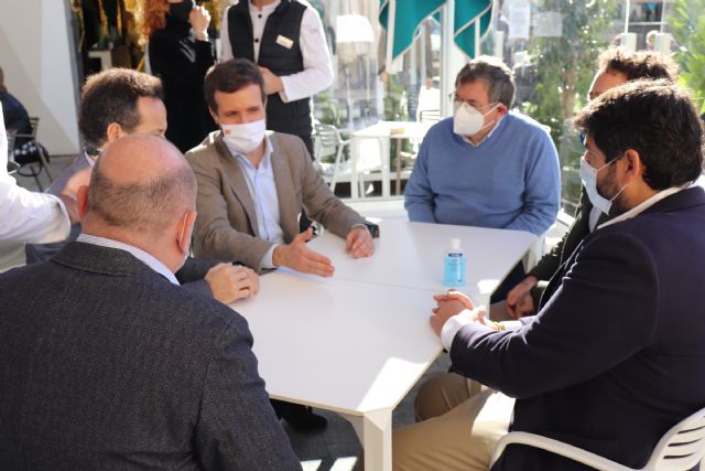 El presidente del Partido Popular, Pablo Casado, junto al el presidente del PPRM, Fernando López Miras, y acompañados por el secretario general del PP, Teodoro García, han visitado esta mañana las instalaciones de la Hermandad Farmacéutica del Mediterráneo (HEFAME), donde han podido comprobar el trabajo que está haciendo la compañía murciana para tener listos los equipos de congelación para distribuir las primeras vacunas.
