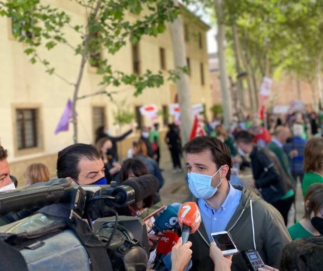 Esta mañana, la comunidad educativa y el mundo cultural de la Región de Murcia han mostrado en las puertas de San Esteban su absoluta oposición al nombramiento de Mabel Campuzano, diputada elegida en las listas de Vox, como consejera de Educación. Su designación, anunciada tras el pacto de López Miras con los seis diputados tránsfugas de Ciudadanos y Vox a cambio de situarlos al frente de consejerías, se estaba produciendo en ese momento dentro de la sede del Gobierno regional. El coordinador autonómico de Podemos, Javier Sánchez Serna, ha participado en esta convocatoria y ha asegurado que el Partido Popular "ha dado un paso más en su blanqueo a la extrema derecha, incorporándola hoy a su gobierno". El diputado de Unidas Podemos ha recordado que este "lavado de cara" comenzó el año pasado con la negociación de los presupuestos, cuando López Miras "cedió al pin parental y a la imposición de la censura en las aulas", con el único objetivo de "poder subirse el sueldo". Ahora, tal y como denuncia Sánchez Serna, "va más allá" e incorpora a los diputados del grupo parlamentario de Vox en su gobierno "para poder seguir tapando su corrupción y hacer una ley a medida con la que poder volver a presentarse a las elecciones".