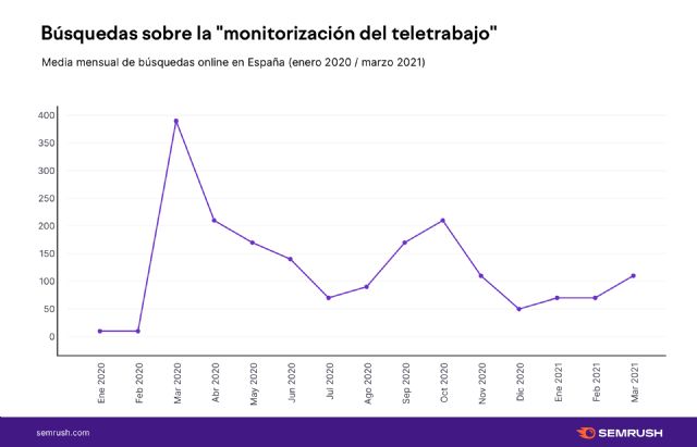 Semrush, la plataforma SaaS líder en gestión de visibilidad online y marketing de contenidos, ha analizado las búsquedas realizadas por los españoles acerca del espionaje empresarial en tiempos de coronavirus. Según las búsquedas en España, la expresión "monitorización del teletrabajo" se disparó un 3800% en el primer trimestre de 2020. Incluso en diciembre de 2020, la media de búsquedas sobre este término seguía aumentando un 400% en comparación con enero del último año.