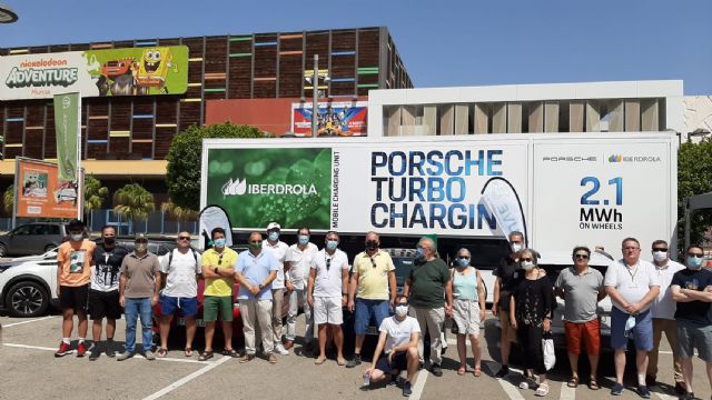 Iberdrola ha organizado en Murcia un encuentro con las diferentes asociaciones de vehículos eléctricos de la Región de Murcia y de la provincia de Alicante junto a la unidad móvil de recarga ultra rápida que la compañía ha instalado en colaboración con Porsche en el aparcamiento del centro comercial Thader.