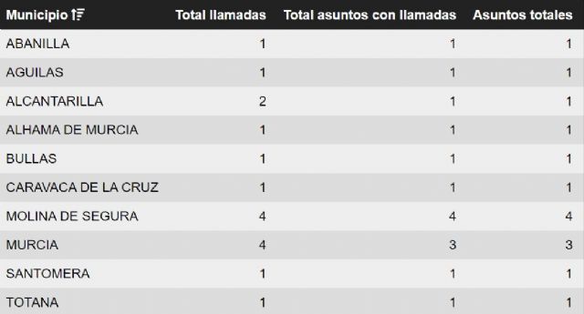 ocasionado víctimas ni daños destacables. Murcia, y Molina de Segura con 4 incidentes , municipios con mas asuntos gestionados.