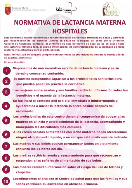 Todos los hospitales de la Región con maternidad y los centros de salud disponen desde inicios de este año de un decálogo para el fomento de la lactancia materna, desarrollado por profesionales del Servicio Murciano de Salud (SMS).