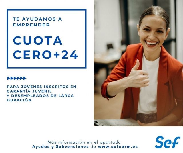 Los jóvenes desempleados inscritos en Garantía Juvenil y los desempleados de larga duración con interés por emprender tienen hasta el 2 de noviembre para solicitar la 'Cuota Cero +24', una ayuda impulsada por la Consejería de Empresa, Empleo, Universidades y Portavocía, a través del Servicio Regional de Empleo y Formación (SEF), que reintegra a sus beneficiarios las cuotas de la base mínima de cotización a la Seguridad Social de los dos primeros años de actividad como autónomos.