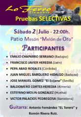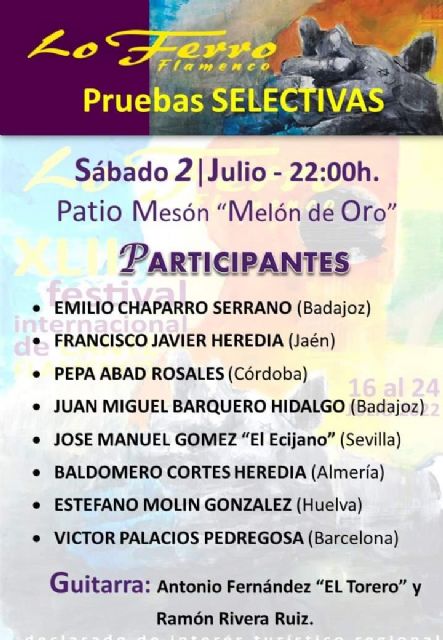El próximo sábado 2 de julio culmina la fase de pruebas selectivas del concurso de cante de la 42ª edición del Festival Internacional de Cante Flamenco de Lo Ferro con la disputa de la quinta y última gala flamenca buscando un puesto en la semifinal de nuestro festival que de derecho a luchar por los premios "Melón de Oro", al cantaor/a más completo/a, y al "Molino de Lo Ferro", a la ferreña mejor cantada.