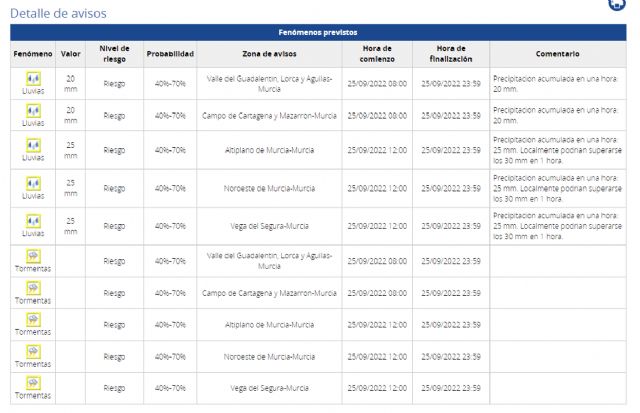 Según señala la Agencia Estatal de Meteorología (AEMET), el domingo 25 de septiembre, en el Valle del Guadalentín, Lorca y Águilas, Campo de Cartagena y Mazarrón podrán alcanzarse 20 mm de lluvia en una hora y 25 mm en Altiplano, Noroeste, Vega del Segura.