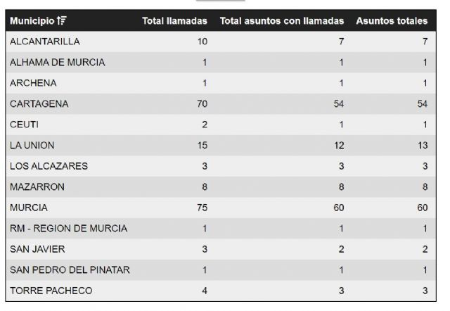 El Servicio de Coordinación de Emergencias 1-1-2 ha recibido desde las 12h hasta el momento actual un total de 194 llamadas correspondientes a 155 asuntos relacionados con los episodios de lluvias y tormentas registrados en la tarde de hoy en la Región de Murcia. Su distribución por tipología y municipios de la Región es la que se recoge a continuación.