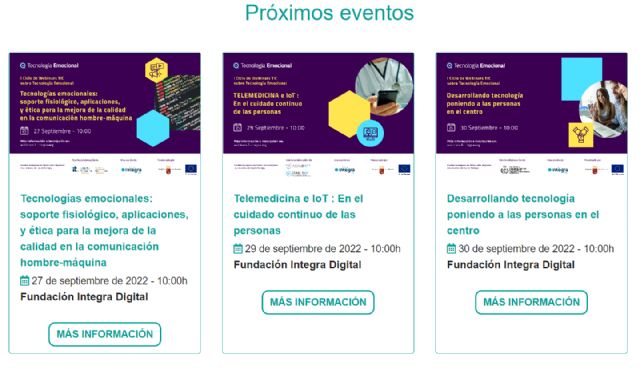 Tras las primeras tres sesiones, celebradas la pasada semana y cuyo contenido se puede consultar en la plataforma de eventos de la Fundación Integra, el martes será el turno de la ponencia titulada 'Tecnologías emocionales: soporte fisiológico, aplicaciones, y ética para la mejora de la calidad en la comunicación hombre-máquina', impartida por el director del grupo excelencia Región de Murcia en Tecnologías emocionales de la Universidad Politécnica de Cartagena, José Manuel Ferrández Vicente.