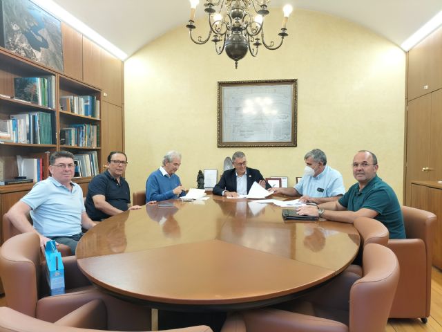 El presidente de la Confederación Hidrográfica del Segura, Mario Urrea acompañado por el comisario de aguas, Javier García director técnico, Carlos Marco, ha mantenido una reunión de trabajo con los representantes de la Comunidad de Regantes de la acequia de rotas, encabezados por su presidente Filiberto Martínez.