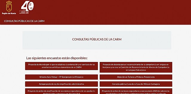 Con esta son ya una docena las consultas públicas que se han realizado a la ciudadanía durante esta legislatura. Actualmente, son dos las que se mantienen abiertas a la participación en estos momentos. Constan de un cuestionario telemático a base de una serie de preguntas y a ellas puede accederse, al igual que a las consultas previas normativas, a través de la plataforma de Participación Ciudadana Región de Murcia.