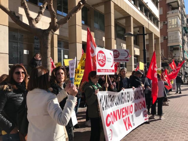 Personal de hospitales privados de la Región se han concentrado hoy, convocados por UGT y CCOO, frente a la Consejería de Salud para reclamar el desbloqueo de la negociación del Convenio colectivo del sector, que lleva 12 años paralizado por el enroque la patronal, la Unión Murciana de Hospitales (UMH).