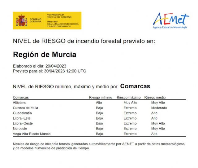 El nivel de riesgo de incendio forestal previsto por la Agencia Estatal de Meteorología para hoy domingo es Alto o muy alto en casi toda la Región de Murcia, excepto en la Cuenca de Mula que es moderado.