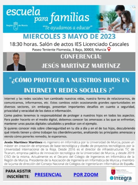 La Escuela para Familias, de la Consejería de Educación, Formación Profesional y Empleo, ha programado para el miércoles 3 de mayo la charla gratuita '¿Cómo proteger a nuestros hijos en internet y redes sociales?', que ofrecerá el ingeniero en Informática Jesús Martínez.
