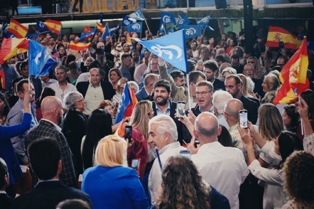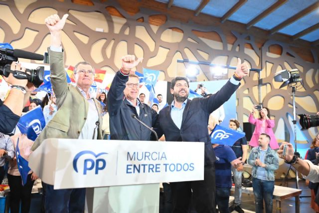 En un mitin celebrado en Murcia, el candidato del PPRM a la presidencia de la Comunidad, Fernando López Miras, junto al presidente nacional, Alberto Núñez Feijoo y el candidato a la alcaldía de Murcia, José Ballesta, afirma que "es urgente una mayoría sólida del PP y el principio de ese cambio tiene una fecha: la del próximo domingo".