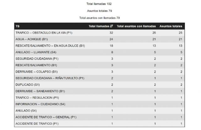 En cuanto a llamadas al Centro de Coordinación de Emergencias 1-1-2, hasta las 20.13 horas de esta tarde se han atendido un total de 102 llamadas relacionadas con lluvias o inundaciones, la mayoría solicitando la intervención de bomberos para achique de agua. La practica totalidad de llamadas se han localizado en Molina de Segura.