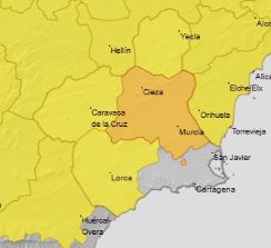 Altiplano, Noroeste y Valle del Guadalentín, Lorca y Águilas. Temperaturas que pueden llegar a los 39 grados y que puntualmente pueden llegar a 40 grados en el interior.