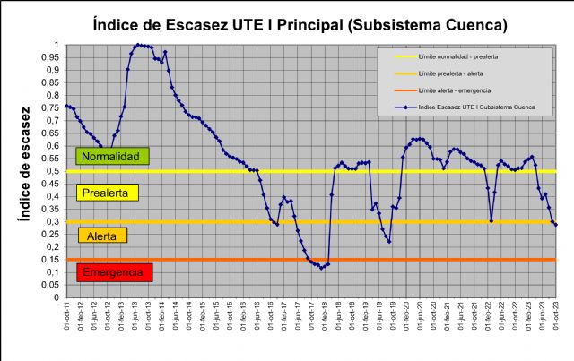 El índice de escasez del sistema global que incluye las aportaciones y existencias de la cuenca y del trasvase Tajo-Segura está en 0.234 sobre 1, que se corresponde con la situación de alerta.