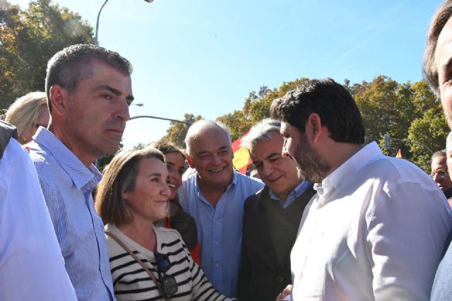 El presidente del Partido Popular de la Región de Murcia, Fernando López Miras, ha asegurado, durante la manifestación organizada por la sociedad civil en defensa del Estado de derecho y la igualdad de todos los españoles, celebrada en Madrid, que "Pedro Sánchez cuenta con el apoyo de los separatistas catalanes, pero no con el de la mayoría de los españoles".