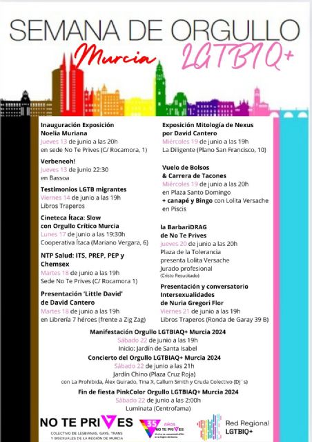 El colectivo de la Región de Murcia, No Te Prives, celebrará el próximo sábado 22 de junio el Orgullo LGTBIAQ+ de Murcia.