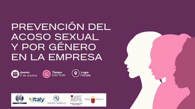 El evento "La importancia del protocolo de prevención del acoso sexual y por razón de sexo y de la sensibilización ante la violencia sexual" será el próximo jueves, 17 de octubre, de 9.30 a 13.30 horas, en modalidad presencial y tendrá lugar en la Federación Regional de Empresarios del Metal de Murcia (FREMM).