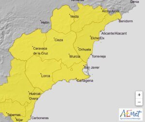 El dia 15, de las 12:00 a 20:00 para toda la región de Murcia, se esperan lluvias de 15 mm/m² en 1 hora. Posibilidad de tormentas y granizo. Con una probabilidad del 40%-70%.