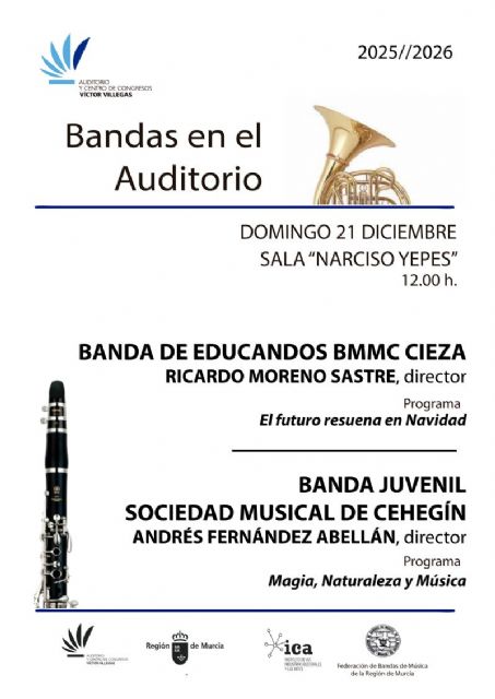 Ambas formaciones han preparado un programa especial para su concierto. En concreto, la Banda de Educandos BMMC de Cieza, dirigida por Ricardo Moreno Sastre, interpretará el programa 'El futuro resuena a Navidad'. Por su parte, la banda juvenil Sociedad Musical de Cehegín, dirigida por Andrés Fernández Abellán, pondrá en escena el concierto titulado 'Magia, naturaleza y música'.