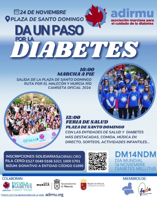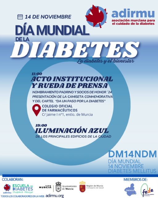 - ACTO INSTITUCIONAL Y RUEDA DE PRENSA, a las 11 de la mañana en el Colegio Oficial de Farmacéuticos, donde se nombrará al Padrino y a la Socia de Honor 2024 y se presentará la Camiseta Conmemorativa pintada por el gran artista murciano Álvaro Peña, y el Cartel oficial de los Actos DA UN PASO POR LA DIABETES.